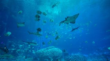 进入大门的通道是一个魔鬼鱼的造型,大型屏幕在上方不停地播放着海底世界动物,这就是第一个区域海洋大街。海洋大街的两旁是购买纪念品的地方,这里主要以迎宾、观光、购物休闲为主。