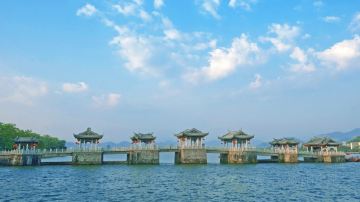 广济桥俗称湘子桥,始建于宋乾道七年(公元1171年),历史悠久。并与赵州桥、洛阳桥、卢沟桥并称为“中国四大古桥”。桥面古香古色,桥身横跨韩江,并集梁桥、拱桥和浮桥于一体,结构十分特殊,堪称我国桥梁史上的孤例。