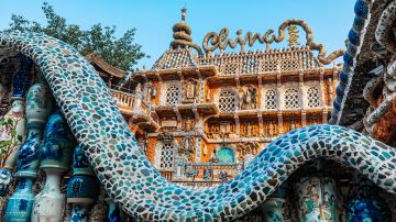 瓷房子的围墙由数百个民国时期和晚清时期的古瓷瓶垒砌串联而成,名平安墙。房顶用古瓷片拼成的巨龙盘旋出“China”的图案,巨龙后是碎瓷片拼出的2008年奥运主体育场鸟巢。注意看房子外围右侧,有一竖排的瓷猫从顶层延伸到一层墙角,瓷猫周边镶嵌满水晶、玛瑙,如此兴师动众装饰的却是一根下水管道,令人赞叹。