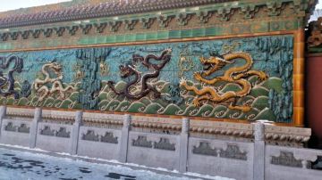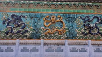 参观【九龙壁】,壁长29.47m,高3.59m,厚0.459m,重达300多吨。是一座背倚宫墙而建的单面琉璃影壁,为乾隆三十七年(1770年)改建宁寿宫时烧造。