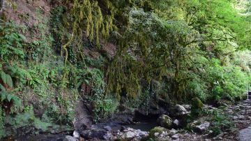 冰瀑为片状水流形成的小瀑布,水量小,面积宽,夏季因为向阳、瀑布壁在水下长满水草,致使形成“翠色珠帘”的效果;冬季水流速度较慢,沿水草易形成冰挂,得名“冰瀑”,是地缝中冬季奇特的景观。