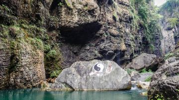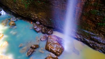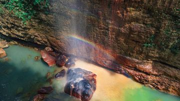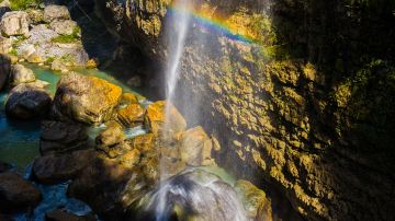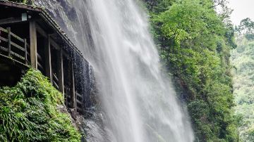 彩虹瀑布为云龙地缝中五大瀑布之一,其水源来自沐抚集镇的地表小沟溪流,水质清澈,常年水流不断。瀑布顶部水流直击地缝岩壁上凸出的心状钙华体后直泻谷底。