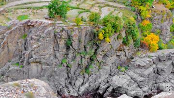 此处崖壁上悬挂的、形如刚出土的灰黑色三块巨型“远古编钟”,庄重、浑厚,为瀑布中钙质经上万年或几十万年沉淀形成的喀斯特钟乳石或钙华体,比真实的出土“编钟”年代更为悠久。而飞流直下的水束击打“编钟”,似在大峡谷奏响一曲“地缝怀古”,余音袅袅。