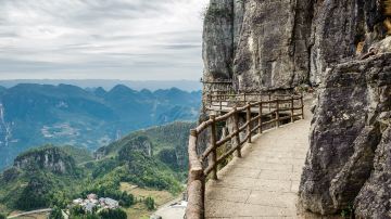 栈道始建于2006年8月,历时1年又8个月建成。栈道位于山体东侧的直立悬崖绝壁山腰,海拔约1700余米,全长488米、高差达300米、石阶118个,与山岩绝壁融于一体。因该栈道建于绝壁之上,故称之为绝壁长廊,或“绝壁栈道”。