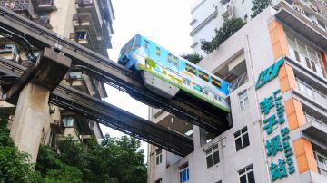 当地网红的轻轨站,轻轨列车从大楼中穿墙而过。