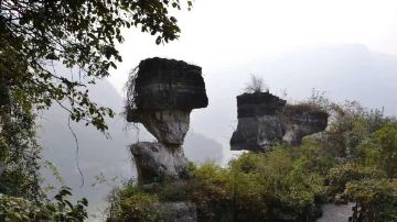 观音坐莲台酷似观音披轻纱,静坐参禅。亿万年来,她经受着风吹雨淋,日晒夜露,暑往寒来,几经沧桑,端坐不变,人称“观音坐莲台”或“莲台峰”。