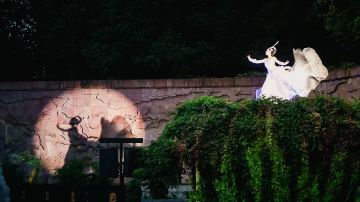 灯光投映出碧绿的荷叶,微粉的荷花,一派夏日风情。随着《仙鹤缘起》故事的展开,黄鹤仙子于水上起舞,池中喷泉如花绽放,水幕与衣裙被灯光映照成梦幻的彩色。