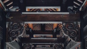四进大堂楼是女眷生活起居的地方,值得留意的是柱子底下的楠木鼓墩,经历了五百多年的历史依然保存了下来,非常珍贵。堂内墙中间有幅对联,写着“轿从门前进,船自家中过”。