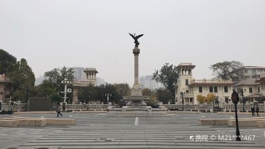 意大利风情区就在海河的旁边,从海河边(北安桥)走过来,首先看到是高高的有尖顶的钟楼,再往前可以看到精致的镂空铜马车,标志着意大利风情旅游区到了。沿街随意逛逛,看看红顶意式建筑群,欧式雕塑,踱步到马可波罗广场。马可波罗广场是景区的标志性建筑之一,中央柯林斯式的石柱上站着手持橄榄枝的和平女神。往西走,是威尼斯广场的“飞狮许愿池”,它远没有《罗马假日》电影里真正的罗马许愿池的气魄和鼎盛人气,可与整个意大利风情区营造的气氛融合,也依稀有电影的感觉了。的确有众多影视剧来这里取景,比如《建国大业》、《金粉世家》等,游人可以在这里找到剧中熟悉的场景,同时,也吸引了很多拍婚纱照的爱侣。