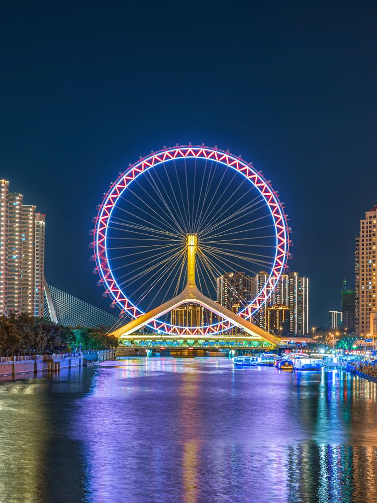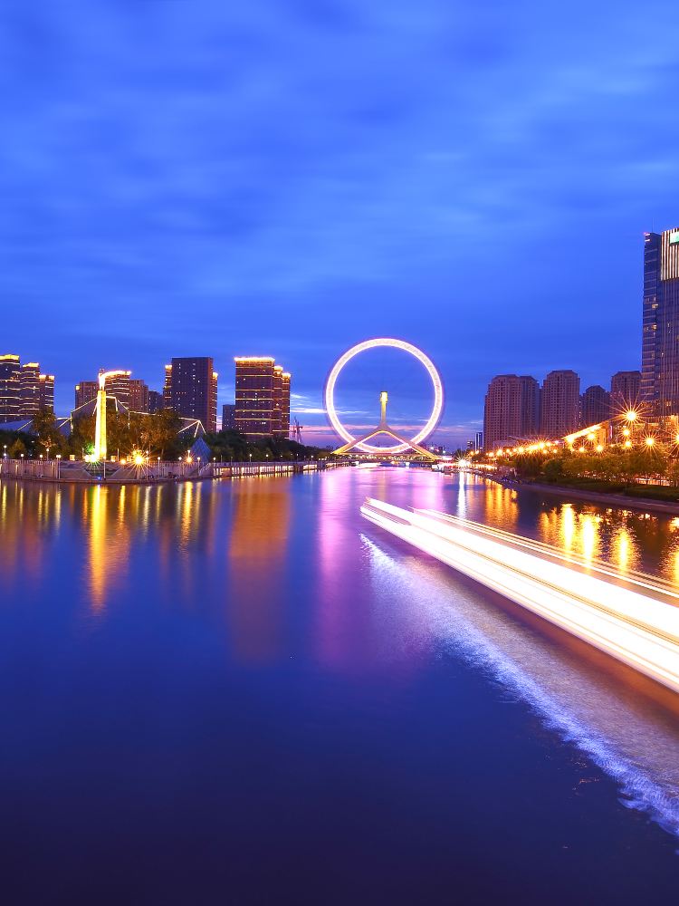 夜晚是观赏海河的好时间,两侧华灯初上,景色非常漂亮,若要拍摄夜景,推荐天津之眼、津塔津门、天津火车站等几个地方。另外,也可以乘坐海河游船沿途观光。
