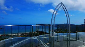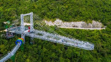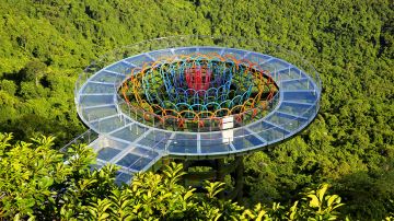全海景玻璃栈桥位于亚龙湾热带天堂森林公园之巅,最高处海拔450米,为全海景玻璃栈桥。玻璃栈桥依山而建,全长400米,由130吨超白进口夹胶玻璃构成,包括凌空台、七彩天梯、彩莲观景台、彩虹之路、山盟海誓及心心相印等景点。栈桥路面全部使用3M*3M的超大单体透明玻璃铺设,在栈桥上行走,上可仰观天高云淡,下可俯视逾百米深的雨林山谷,前可俯视亚龙湾全景,胆战心惊之余,更可享受凌空而行的快乐。