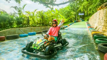 雨林飞漂又被称为“林上飞水上漂过山车”。飞漂滑道由高强度钢化双层夹胶玻璃构成,全长3100米,落差280米,相当于从93层高的楼顶往下飞速滑落。飞漂全程有弯道28处,总长600米,其中C型弯道17处,S型弯道11处,更有多处连续S型大转弯。雨林飞漂宛如林上飞水上漂的过山车一般,时而飞掠雨林之巅,时而穿越密林深处,时而俯瞰山海美景,时而探密雨林奇观。体验者在享受惊险与刺激的同时,可近距离接触根抱石、高板根等热带生态奇观,还可与热带常见的巨型蜘蛛、眼镜蛇、大象、猕猴、鳄鱼、长颈鹿等野生动物来一次亲密互动。
