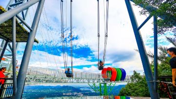 游客中心出发——乘坐大巴至索道上站乘坐索道抵达哇哎噜玻璃观景平台:体验哇哎噜玻璃观景平台、魔鬼秋千、悬崖观海秋千、高空滑索项目——游览雨林谷:漫步雨林栈道、观赏雨林奇观——抵达萌宠乐园,体验零距离投喂等互动——前往湿地景观区,体验雨林拓展、高空威亚项目等项目——乘坐索道返回大门景观区