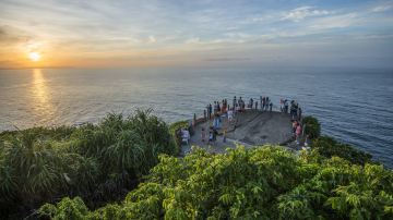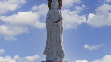 南山海上观音是座108米高的观音菩萨圣像,位于南山寺前的海上金刚洲(观音岛)上,其圣象为正观音的一体化三尊造型,脚踏一百零八瓣莲花宝座,宝相庄严雄伟。海上观音是三亚著名的佛教建筑,也是著名的祈福胜地。
