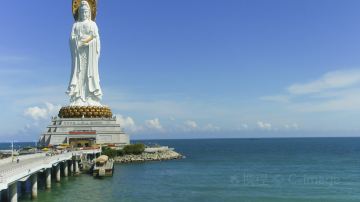 若是步行,过了南山寺后经过大象石雕往左走约1公里就是108米的海上观音。