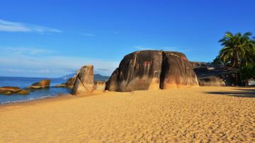 天涯海角位于三亚湾西端,是一片宁静美丽的海滩。海滩上耸立着许多形态各异的岩石,其中有名的是刻有“天涯”和“海角”两块巨石,它们一直被视为爱情的象征,也是三亚标志性的景观之一。