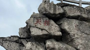 南天门下方,有船状的卧龙石,名飞来船,衬以流云,好比船在云海中乘风破浪,而南天门的石牌坊,就是高耸的桅杆。牌坊分中门和左、右川门,中门上方横额镌有“南天门”三个描红大字,左、右横楣上刻有“行云”、“施雨”,字迹端正醒目。