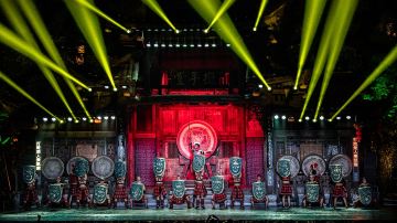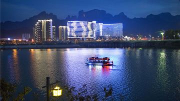 在天门山索道下站附近,有交通车可以到“峡谷大剧场”,在这里可以观看实景演出、魔幻音乐剧《天门狐仙》。该故事改编自神话传说《刘海砍樵》,讲述了一段感天动地的人狐之恋。现场音乐、灯光烘托,以及超大月亮、狐精变幻、漫天飞雪、高空飞桥等一幕幕引人入胜的场景,将这段传奇的爱情展现得淋漓尽致。