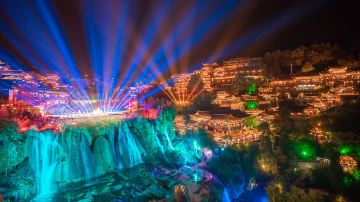 这里家家都有南瓜灯,夜幕降临,华灯初上,加上打着彩光的瀑布,夜景十分炫丽华美,如同天上的宫殿,令人陶醉。