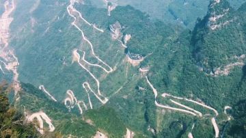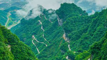 天门山国家森林公园因自然奇观“天门洞”而得名。游览景区时,须乘坐长达约7500米的索道,你可以在缆车中俯瞰脚下盘旋在峭壁之间的通天大道和山中美景。胆大的还可以走一走贴壁悬空的玻璃栈道,体验凌空行走的刺激。