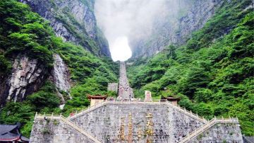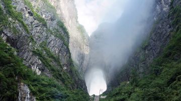 天门洞,位于天门山山体中部,是台地边缘的一个地下溶洞,因向斜构造之力挤压、坍塌、溶蚀,南北两端岩层崩落。天门山古称嵩梁山,三国吴永安六年(公元263年),山体忽然峭壁洞开,玄朗如门,形成迄今罕见的世界奇观——天门洞。吴帝孙休认为这是吉祥征兆,于是易嵩梁山为天门山。天门洞高131.5米,宽57米,深60米,南北对开千寻素壁之上,扶摇而通天,气象变化万千,似明镜镶嵌于蔚蔚天幕之上,终年白云紫雾,氤氲蒸腾,气势磅礴,巍峨高绝,是世界罕见的高海拔天然穿山溶洞。