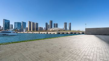 广场地下由约200万立方米的土石方回填、140余块大圆筒护岸和约12000块四脚空心块筑成的防波堤三大部分组成;地上由石材铺装、音乐喷泉、“飘带式”绿化景观带和观景台四大部分组成。
