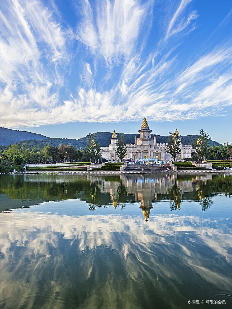 白天你可以看看禅乐馆、百花堂、妙音台、拈花堂、拈花塔等建筑,逛逛工艺品小店,逛累了可以坐下来吃吃喝喝。晚上可以拍摄拈花湾寂静的夜景,看看拈花湖上奇特的3D水幕电影。
