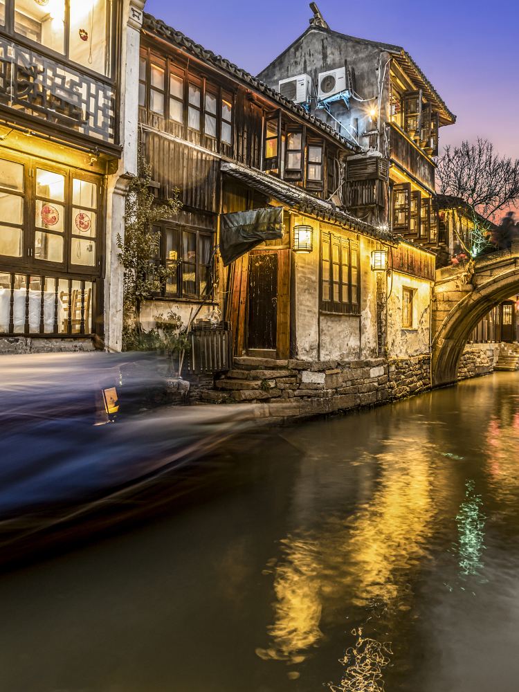 周庄是江南闻名于世的水乡古镇,镇上水路纵横,明清老建筑依河而建,画家陈逸飞笔下的双桥刻画出小桥流水人家的温柔,古镇南边的南湖开阔美丽。夜晚周庄亮了灯,又别有一番意境。