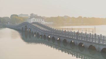 东西走向的全福长桥横跨于南湖上,这是一座现代石拱桥,全长235米,有43个拱型桥孔,造型纤长优美。这里没有周庄古镇核心景点的喧嚣,走在桥上,吹着徐徐微风,可以享受难得的宁静。晚上,全福长桥还会亮灯。