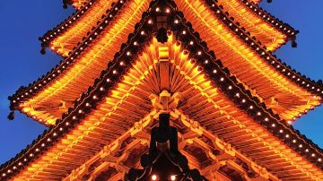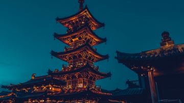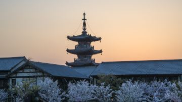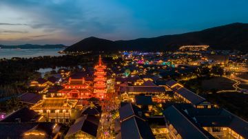 拈花塔是一座唐风木质结构楼阁式的佛塔,由须弥座台基、塔身、塔刹三部分组成,古朴典雅,庄重之中又融合了唐风和禅意。拈花塔是拈花湾小镇香月花街的制高点,到了夜里,亮塔仪式开启,拈花塔上的“福光”便会照耀四方,不失为一场美丽的灯光秀。