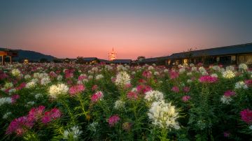 “拈花湾”的命名,一方面源于灵山会上佛祖拈花而迦叶微笑的经典故事拈花一笑,同时也缘于它所在的地块形似五叶莲花的神奇山水。在拈花湾的东面,靠近山的地方,有一大片坡地,叫做“梵天花海”。“梵天”是古时候印度婆罗门教的创造之神,引入佛教后,变成佛教的护法之神。“梵天”也就成为浩瀚广阔的代名词。