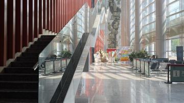 新馆大门是入口,忠王府大门是出口。进馆后可以好好欣赏一下这座新馆建筑,它由建筑大师贝聿铭设计,有着传统的苏州园林风格,高低错落,深灰色屋面与白墙相配,清新雅致。屋顶上金字塔形的玻璃天窗让博物馆内充满自然光线,在大门、天窗廊道、凉厅及各展厅都可以看到这个特点。馆中还有庭院、水池、石桥,既传统又现代。漫步在新馆庭院中,蓝天、白墙、绿竹、清水,十分惬意;走在石桥上还能看到白墙下用砂石堆砌而成的画,很有特点,不妨拍照留念。