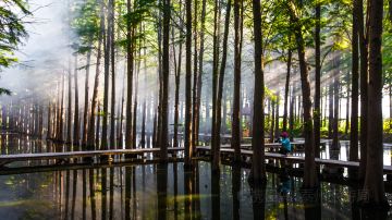 “林中有水、水中有鱼、林内有鸟”是李中水上森林的公园的特色。跟着公园内导游牌的指示,游走在小九寨沟、板桥栈道、难得糊涂林、步云桥、林中水巷等景点间,阳光透过树叶一丝一丝洒落,林间阵阵清风吹过,不时传来鸟儿婉转的鸣唱。林中还有水上小木桩,可以行走其上,体验水上漂的感觉。在雾森幻境中,将净化后的地下水通过高科技装置进行雾化,将3500平方米的森林营造出烟雾缭绕的意境,夏天来此避暑再适合不过了。