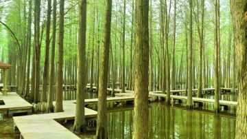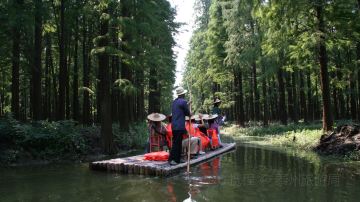 进入景区,左侧便有一个渡口,可以由此乘坐木筏。缓缓漂流在河道间,看两旁大片的池杉、水杉扎根于水中,屹立而起、高耸入云,俨然一片绿色水上森林。林中鸟类品种繁多,有猫头鹰、野鸭、白鹭、黑杜鹃、草鹦鹉、喜鹊等,树梢上的鸟巢随处可见。林中鸟平时有3万多只,最多时有6万多只。也许在不经意间便会惊起林间水滩上栖息的水鸟,展翅飞起的鸟儿引得许多摄影爱好者举起相机抓拍。