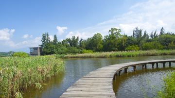 湿地设有三间观鸟屋,先到达的是河畔观鸟屋,屋里设有椅子和望远镜,可以上到三楼眺望附近的景致,退潮时在一楼也可观赏到多种鸭、鹭鸟和琵鹭。出了河畔观鸟屋就是红树林浮桥,这是一座架在红树林水域上的浮桥。在桥上,你可以置身红树林生态之中。