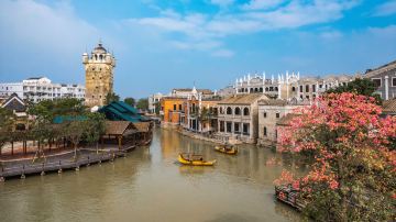 广东赤坎古镇侨乡国际旅游度假区,位于广东省开平市中部潭江河畔。已有370年开埠建墟历史的赤坎古镇,由上埠关族、下埠司徒氏在古镇东西两端聚居发展而成,拥有600多座骑楼,于2007年被评为中国历史文化名镇。数百年来,在关族和司徒氏良性竞争下,赤坎古镇的建筑风格和民风生活融汇中西,凭借独特的华侨文化和家族管理体系发展成岭南独树一炽的商贸重埠。随着时代的发展,古镇历经兴衰,为了整体保护和利用,复兴华侨文化,开平市政府携手中信产业基金和乌镇团队,以历史骑楼街区作为宏大背景资源,打造集观光游览、休闲度假、商务会展、文化创意和古镇体验功能为一体的综合休闲旅游度假区。度假区包括 8家精品型酒店、4家主题型酒店、14家不同特色的民宿客栈,13间餐厅以及238间商铺,9个文化展示点(省文保单位)及完善的配套服务设施。广东赤坎古镇侨乡国际旅游度假区,将会是集岭南文化、华侨文化、乡村文化、休闲文化于一体的展示平台,成为广东乃至全国有重大影响力的文旅新地标、全省文化产业赋能乡村振兴的重点项目和典型范例、传播中华传统文化的新载体。
