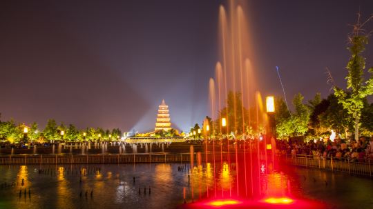 大雁塔北广场音乐喷泉又叫西安音乐喷泉,位于大雁塔北广场中轴线上。音乐喷泉广场由水景喷泉、文化广场、园林景观、文化长廊和旅游商贸设施组成,是全国较重要的唐文化广场。广场上有数量庞大的雕塑、雕像,在欣赏音乐喷泉之余,细细的品味一下这些雕塑也是不错的选择。