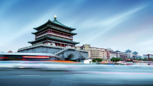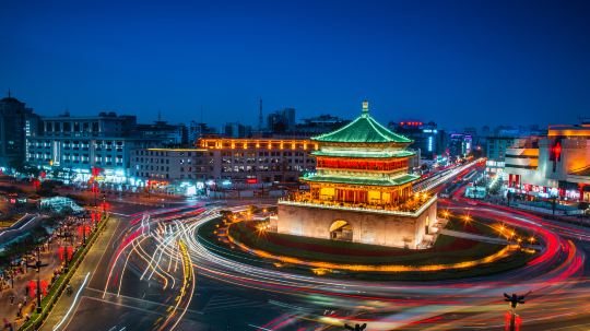 西安钟楼是国内规模较大,保存完整的一座钟楼,始建于明洪武十七年(公元1384年),钟楼处于西安的中心地带,是古城的地标之一,以它为中心辐射出东、南、西、北四条大街并分别与西安城墙东、南、西、北四门相接。