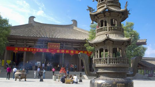 法门寺,位于宝鸡市扶风县以北约10公里的法门镇,始建于东汉末年。这座唐代的“皇家寺庙”,因安置了佛教界至高物——佛祖释迦牟尼的“指骨舍利”,而成为举国仰望的佛教圣地。如今的法门寺分为两部分:唐代风格的旧址建筑群(法门寺院和珍宝馆)与令人争议的新建文化景区。