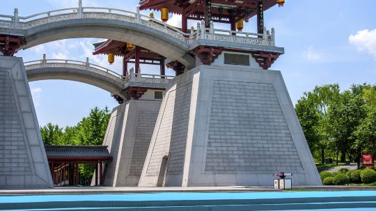 文化景区的西南边就是法门寺院和珍宝馆。寺院内的真身宝塔下,就是发现“佛指舍利”的地宫,如今在地宫中可以近距离观赏三枚“影骨”。从地宫出来,你还可以在清净的寺院中随意逛逛,寺院中有钟鼓楼,大雄宝殿和放生池等,都是典型的唐代风格建筑。