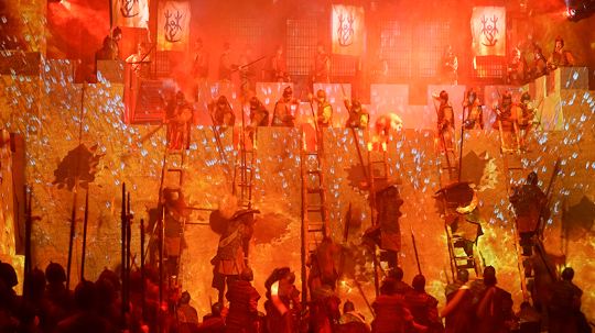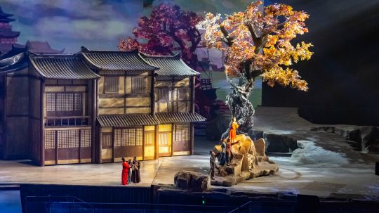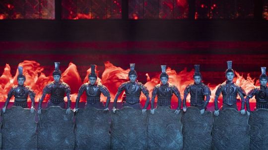 演出的灯光和布景也让人惊艳,华清池的亭台、湖水等元素被巧妙地融入剧中,伴随着音乐,湖面上喷起浪花,燃起火海。舞台背后,灯光勾勒出骊山的轮廓,点点灯光好似漫天的星辰落在山体上。