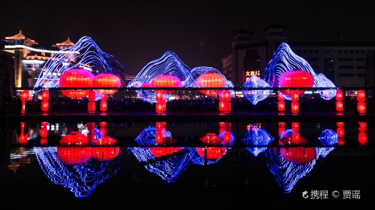 在鼓楼和钟楼之间为钟鼓楼广场,绿草红花点缀其间,有造型独特的音乐喷泉,这里的夜景很美,适合拍照。鼓楼后边就是拥有众多美食的回民街。