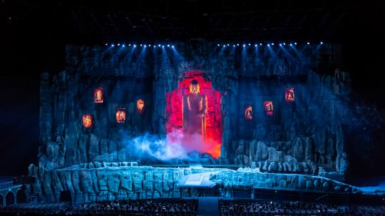 西安华夏文旅大剧院作为华夏文旅西安度假区项目的标志性建筑,设计为一座长142米,宽128米,高约50米的大型椭球体建筑物,可容纳3000人同时观看演出。剧场中央巧妙设计并修建一座可移动观众席,打破了世界单一舞台演出模式,通过旋转行走看台将观众送至观演位置,带给观众全新的视听享受。