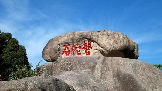 “海天佛国”石刻位于香云路旁的巨石上,是普陀山上标志性的摩崖之一。它就在法雨寺去往慧济寺的山路旁,若是步行上山,一定不会错过。“海天佛国”四字很好地概括了普陀山风景的特色,因此不少游人在此留影。