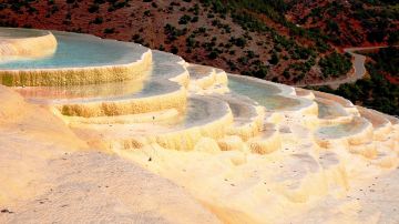 云南也有“土耳其棉花堡”,它就是白水台,位于香格里拉县三坝乡,距离香格里拉县城约一百公里。郁郁葱葱之中露出白色的华台,层层叠叠,仿佛一片白色的梯田。相传,纳西族的神灵为了让人们学会种田耕地,特地变幻出这样一片梯田,后人称之为“仙人遗田”。