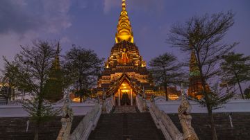 景洪大金塔,也称缅甸大金塔,位于景洪市沧江新区宣慰大道江北段环岛旁。景洪大金塔身高六十六点六米,寓意一江连六国,其中四小塔为实心塔,大塔为贝叶经博物馆,共两层使用空间,有东西南北四个入口,正中塔柱周围供奉星期佛,供游人祈福。