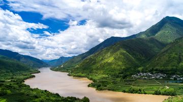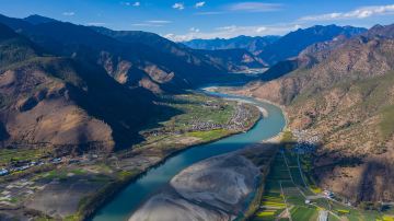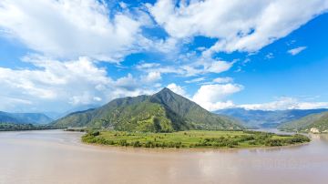 在距丽江城区约50公里的石鼓镇,滚滚长江被山崖阻挡,急转成一个“Ⅴ”形大弯,这就是有名的长江第一湾。这里的江水平缓如镜,两岸是江南水乡一般的青山、整齐划一的农田和村镇,高原上有这番景致,令人称奇。
