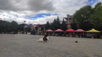 广场两旁分别是红军长征博物馆和迪庆博物馆,另外还耸立着一座转经筒,金黄的身影刺破青天,就如顶天立地的巨人。据说口念六字真言绕经筒转三圈,会带来幸福和安康。月光广场不大,除了那些历史给留下的人文景观外,还有有马、牦牛和藏獒,用来供游人拍照。
