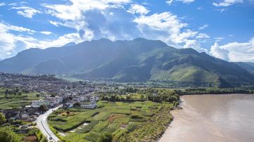 从中虎跳沿着公路前行,经过山体松动滚石连连的“滑石板”,眼前忽然一片开阔,江面变得开阔,江水趋于平缓,宛如峡谷中出现了一个巨大的水库,这里就是下虎跳。远处阡陌纵横,炊烟袅袅,已是丽江市的大具乡了。