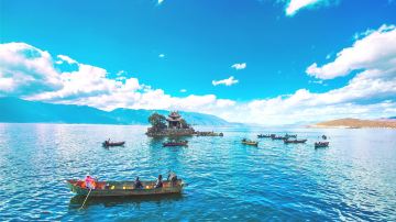 乘坐洱海游船,可以远观小普陀岛,登南诏风情岛,近距离观看汉白玉观音像。